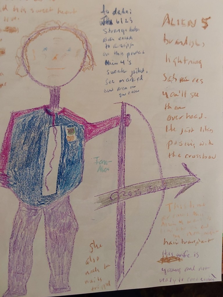 Alex. With a crossbow. I don’t know exactly what they look like but I know he usd to have one. I give him a little but of alien 5 character here; he is a person n of superior intelligence.